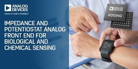 BANGALORE, India, May 29 2019–. ̶ Analog Devices, Inc. announced today a new electrochemical & impedance measurement front end that enables the next generation of vital sign monitoring devices and intelligent electrochemical sensors. The AD5940 analog front end incorporates both potentiostat and electrochemical impedance spectroscopy (EIS) functionality on a single chip, allowing for sensor measurement in both time and frequency domains. The device features integrated hardware accelerators for advanced sensor diagnostics, best-in-class low noise for accurate sensor measurements and is designed for wearable “always-on” applications. Compared to traditional discrete solutions which pose limitations and require multiple ICs to achieve similar performance, ADI’s single chip solution offers advantages in terms of system accuracy and size flexibility to measure 2-Lead, 3-Lead and 4-Lead electrochemical sensors. It’s an ideal solution for applications, where high precision biological and chemical sensing is mission-critical, such as industrial gas sensing, liquid analysis, material sensing, vital signs monitoring, impedance spectroscopy and disease management.