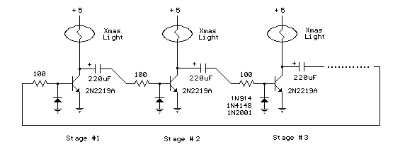 Assume the circuit doesn’t start when power is applied amd all lights are off and all three capacitors are charged to about 5 volts. We connect a jumper across the 220uF capacitor on the left which discharges the capacitor and turns on the 2nd stage transistor and corresponding light. When the jumper is removed, the capacitor will start charging through the base of the stage 2 transistor and stage 1 light. This causes the stage 2 transistor to remain on while the capacitor continues to charge. At the same time, the capacitor connecting stage 2 and 3 will discharge through the 100 ohm resistor and diode and stage 2 transistor. When the capacitor charging current falls below what is needed to keep stage 2 turned on, the transistor and light will turn off causing the voltage at the collector of the stage 2 transistor to rise to 5 volts. Since the capacitor connecting stage 2 and 3 has discharged and the voltage rises at the collector of stage 2, the capacitor from stage 2 and 3 will charge causing the 3rd stage to turn on and the cycle repeats for sucessive stages 4,5,6,7…. and back to 1. The sequence rate is determined by the capacitor and resistor values (220uF and 100 ohms in this case), load current (200mA in this case), and current gain of the particular transistor used. This arrangement runs at about 120 complete cycles per minute for 3 lights, or values.