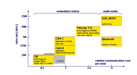 The growing number of Electronic Control Modules (ECMs) within the vehicle creates an environment for the “networked” vehicle. Advancing ECMs are essential, in order for car manufacturers to produce smarter vehicles that are pleasing to drive, and are more reliable, and safer. Networks are a key element of the vehicle’s electrical architecture. Figure 3 shows the various communication networks utilized within the vehicle, along with the relative cost to implement a node for each. Two of the most popular automotive networks are the Controller Area Network (CAN) and Local Interconnect Network (LIN).