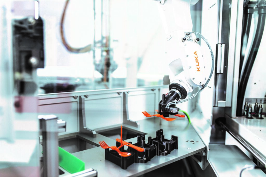 The use of such compact and variable assistants also makes sense for small and medium-sized companies as the manufacturer documents in various success stories [4]. These include a university project in which students at the University of Reutlingen/Germany are researching reusable alternatives to disposable plastic cutlery. They are supported by German injection molding expert Gindele as well as by Kuka and their system partner Robomotion. All handling around injection molding is covered by a highly flexible robotic cell, the core of which is an Agiluscompact robot equipped with a 3D-printed gripper [5].