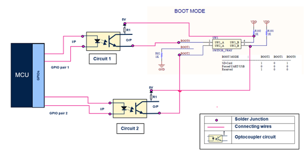Figure 2 demonstrates the circuit diagram where MCU can control the state of two-way Switch SW1. VDD is connected to one end of output and R1 register is added to limit current. The value of R1 is based on the embedded device specification. In the default state, the physical switch is put in off state. Then depending on which boot combination we want, MCU will enable the output side of Optocoupler circuit.