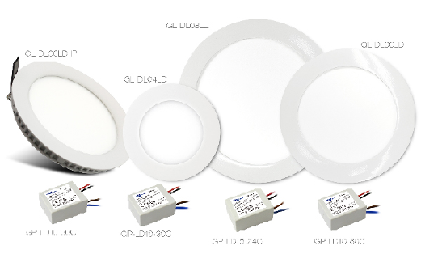 The brightest and largest (Ф 240 x 13mm) of the four down lights, the GL-DL08LD has a different constant current driver than the three other lights (GP-LD15-24C instead of GP-LD10-30C). This down light for indoor applications consumes 18W of energy.