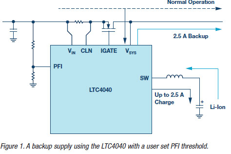 Thus, when external power is available, the device would operate as a step-down battery charger for single-cell Li-ion or LiFePO4 batteries while giving preference to the system load. However, if the input supply was to suddenly drop below the adjustable power-fail input (PFI) threshold the IC would need to operate as a step-up regulator, capable of delivering multiple amps to the system output from the backup battery. Accordingly, if a power failure were to occur, then the IC would need power path control to provide reverse blocking and a seamless switchover between input power and the backup power source. Typical applications for such an IC would include fleet and asset tracking, automotive GPS data loggers, automotive telematics systems, toll collection systems, security systems, communications systems, industrial backup, and USB-powered devices. Figure 1 shows a typical application schematic for this purpose using Analog Devices’ Power by Linear™ LTC4040 lithium ion battery backup manager.