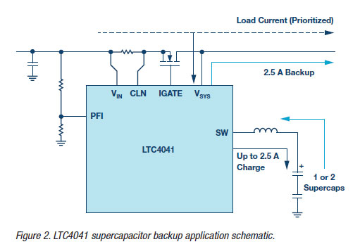 It is well known that supercapacitors have higher power density than batteries, making them an ideal choice for systems whose applications require high peak power backup for brief time intervals. By way of example, the LTC4041 from Analog Devices’ Power by Linear product line uses an on-chip bidirectional synchronous converter to provide high efficiency step-down supercapacitor charging, as well as high current, high efficiency boost backup power. When external power is available, the device operates as a step-down battery charger for one or two supercapacitor cells while giving preference to the system load. When the input supply drops below the adjustable PFI threshold, the LTC4041 switches to stepup mode operation and can deliver up to 2.5 A to the system load from the supercapacitor(s). During a power fail event, the device’s PowerPath™ control provides reverse blocking and a seamless switchover from input power to backup power. Typical applications for the LTC4041 include ridethrough “dying gasp” supplies, high current ride-through 3 V to 5 V UPSs, power meters, industrial alarms, servers, and solid-state drives. Figure 2 shows a typical LTC4041 application schematic.