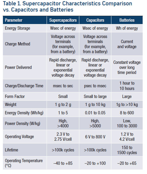 Batteries, on the other hand, can store a lot of energy, but are limited in terms of power density and delivery. Due to the chemical reactions that occur within a battery, they have limited life with regard to cycling. As a result, they are most effective when delivering modest amounts of power over a long period of time, since pulling many amps out of them very quickly severely limits their useful operating life. Table 1 shows a summary of the pros and cons among supercapacitors, capacitors, and batteries.