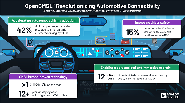 OpenGMSL’sstandard isbased on ADI’s industry-leading, road-proven Gigabit Multimedia Serial Link (GMSL) technology.Paul Fernando, President of OpenGMSL Association, shared, “With over 1 billion GMSL ICs shipped and adoption by more than 25 global OEMs and 50 Tier-1 suppliers, GMSL is one of the most mature and road-proven high-speed video link technologies in the automotive industry. OpenGMSL builds on this strong foundation to accelerate innovation across autonomous driving, ADAS, and next-gen infotainment — growing an already thriving ecosystem into an open, collaborative future.”