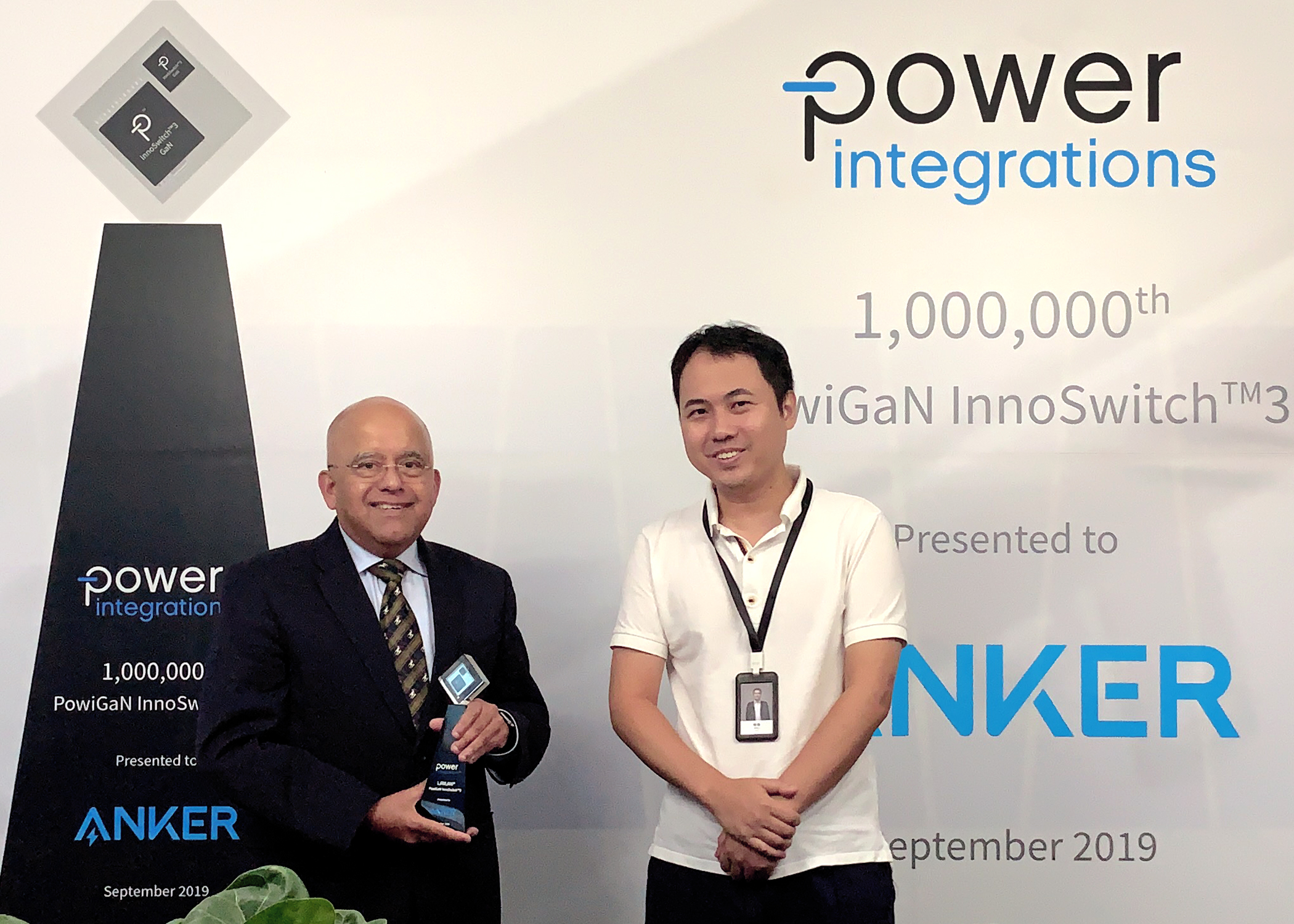 San Jose, Calif. – September 30, 2019 – Power Integrations (Nasdaq: POWI), the leader in high-voltage integrated circuits for energy-efficient power conversion, today announced the delivery of its one-millionth InnoSwitch™3 switcher IC featuring the company’s PowiGaN™ gallium-nitride technology. In an event at the Shenzhen headquarters of Anker Innovations, Power Integrations CEO Balu Balakrishnan presented the one-millionth GaN-based IC to Anker CEO Steven Yang. Anker is a leading manufacturer of chargers and adapters, supplying retailers worldwide with powerful, compact USB PD adapters and a wide range of chargers and adapters for laptops, smart mobile devices, set-top boxes, displays, appliances, networking gear and gaming products.