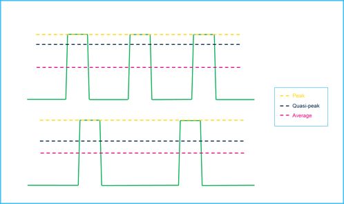 Peak detection retains the peak value of each harmonic in an emitted signal, indicating the worst-case scenario. Average detection provides the average amplitude of each signal component across its period. Quasi-peak detection weighs each component based on its repetition rate: the faster the repetition rate, the higher the weight given to that component.