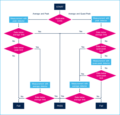In all cases, the EUT should conform to the average limit. For frequencies where both peak and quasi-peak limits are defined, the EUT should conform to either the peak or the quasi-peak limits, as specified in the test plan. For frequencies where only peak limits are defined, the EUT must conform to the peak limit.