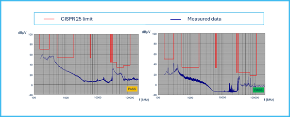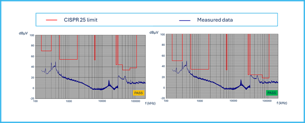 The electronic fuse VNF9Q20F is able to pass all the limits imposed by CISPR 25 for both peak and average limits in class 5.