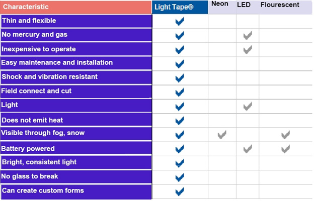 Light Tape® uses less than one tenth of the power and is half the price of Neon and Cold Cathode display lighting, is easier to install and maintain, reduces light pollution, produces no waste heat or infrared light, is fully recyclable, and uses No Gas, No Glass and No Mercury.