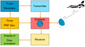 Next, let’s take a look at a simplified block diagram of a pulsed radar system as shown in Figure-2. Actual block diagrams could be much more complicated, but this figure shows all of the essential blocks of the radar system. This diagram shows the master timer or PRF generator as the central block of the system. The PRF generator will time synchronize all components of the radar system. This is shown with the connections to the pulse modulator, duplexer or transmit receive switch, and the display processor.