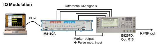The M8190A can be used in varoius ways to genrate high wandwidth signals. In Figure-5 M8190A generates differential I and Q data signals on its two channels. These are connected to Agilent PSG (E8267D) Vector Signal Generator which is used as up-converter to upconvert the signal to the final RF frequency. A marker output of the AWG may be connected to PSG to control its built-in pulse modulator to achieve a better suppression of the carrier during the off-time of a pulsed signal. This setup allows approximately 2GHz bandwidth right up to 44 GHz carrier frequency.