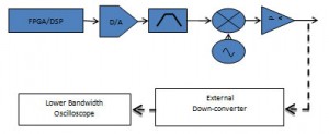 Traditionally, analysis of such wideband signals is achieved using a down-converter and analyzing these signals using a low bandwidth oscilloscope. The potential lowlights of this technique is that the down-conversion hardware will introduce its own impairments which could be LO phase noise, mixer spurs/noise/nonlinear impairments, inter-symbol interference (or ISI), group delay from the filters , and amplifier nonlinearities such as gain and phase distortion. This will definitely make it difficult for the designer to tell if the measurement results are true representation of the actual transmitter DUT, or if the measurement results are instead a result of the down-conversion hardware and its related impairments, or a combination of both the DUT and the down-conversion hardware.